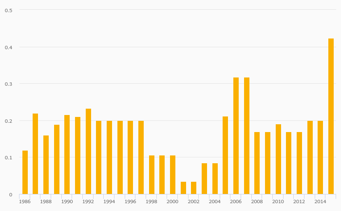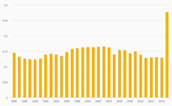 Distillate Fuel Oil Consumption (As % of Worldwide Consumption) rose 115% to 0.277% in Tunisia in 2015