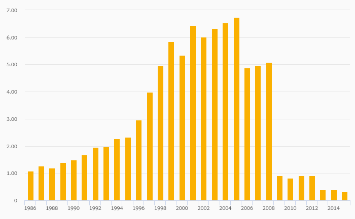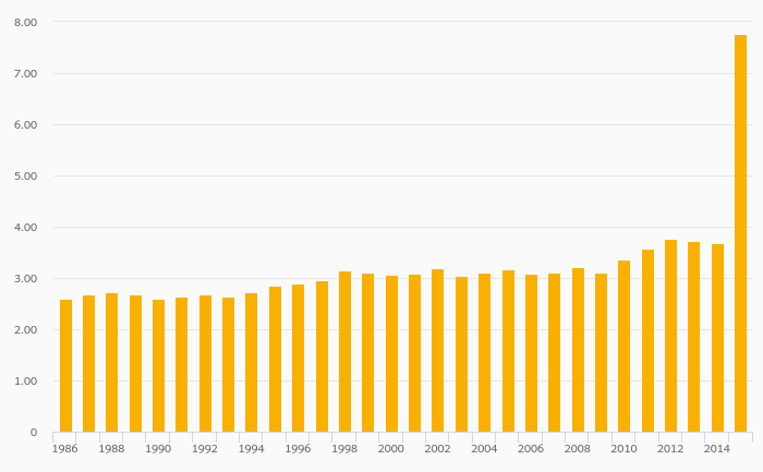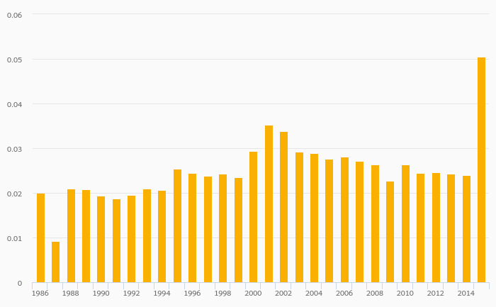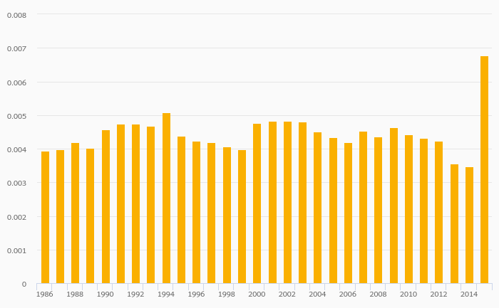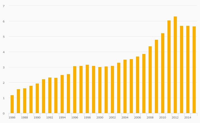 Distillate Fuel Oil Consumption (As % of Worldwide Consumption) rose 112% to 7.77% in Brazil in 2015