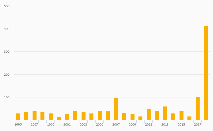 International Tourism, Expenditure (USD) rose 302% to USD 412 mil in Guinea in 2018