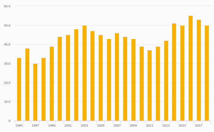 International Tourism, Expenditure (USD) fell 5.66% to USD 50.0 mil in Belize in 2018