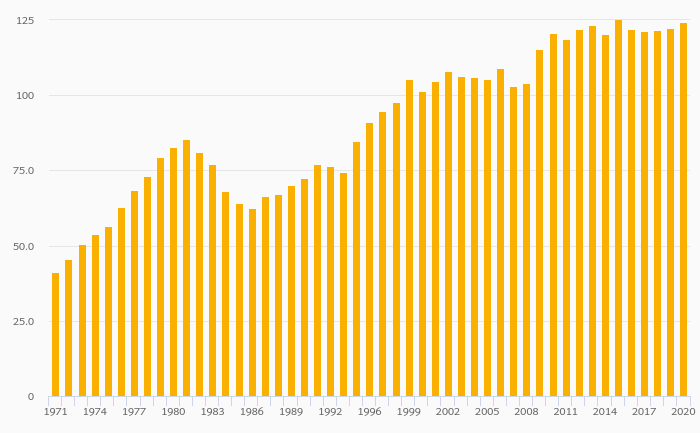 Gross School Enrollment, Female (Primary Education) rose 1.83% to 124% in Togo in 2020