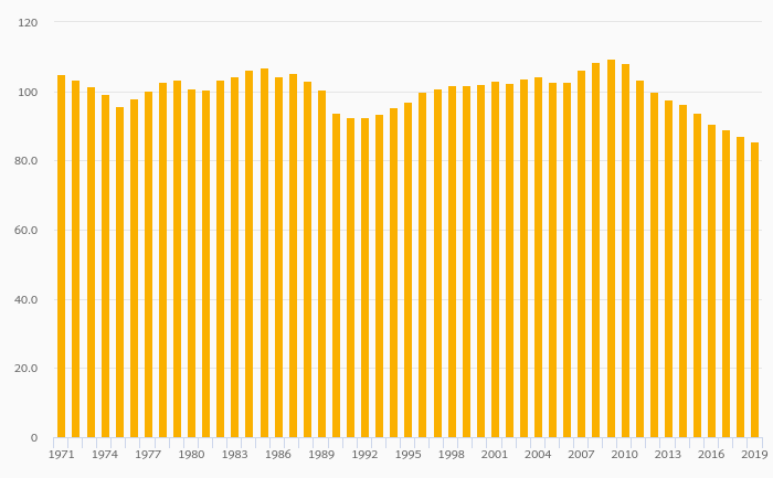 Girls to Boys In Primary and Secondary Education fell 1.25% to 101% in India in 2020