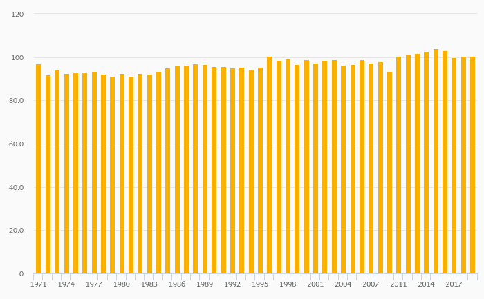 Girls to Boys In Primary and Secondary Education rose 0.099% to 101% in Malta in 2019