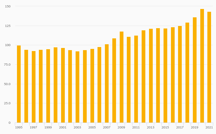 Households' Dwellings Assets (As % of GDP) fell 2.41% to 143% in Finland in 2021