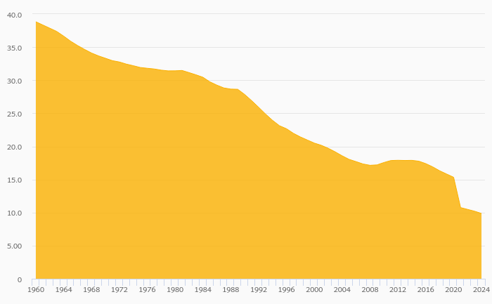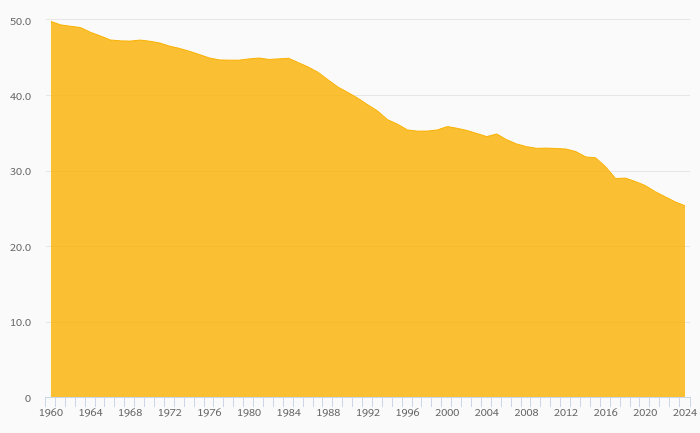 Crude Birth Rate (Per 1,000 People) fell 2.02% to 25.4 births in Ghana in 2024