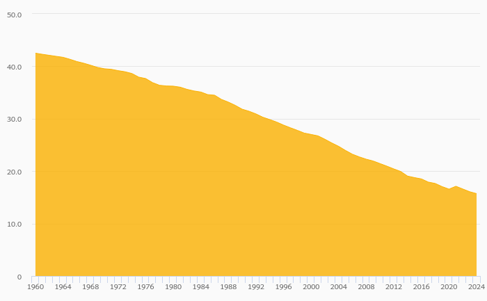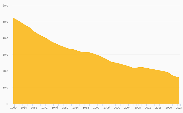 Crude Birth Rate (Per 1,000 People) fell 2.26% to 15.7 births in India in 2024