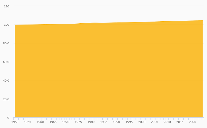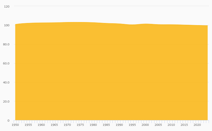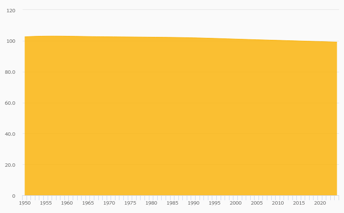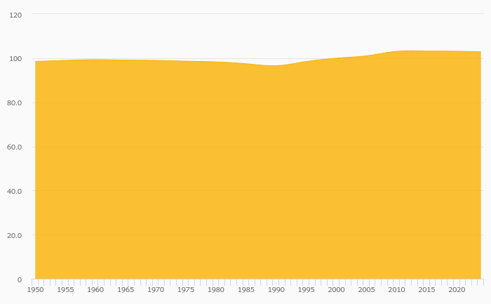 Sex Ratio (Males Per 100 Females) fell 0.071% to 103 persons in Guyana in 2024