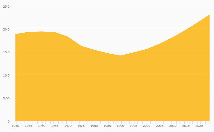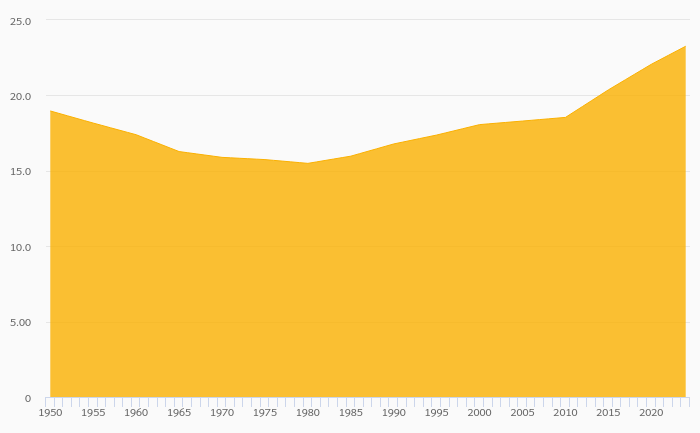 Median Age rose 1.67% to 23.1 years in Yemen in 2024