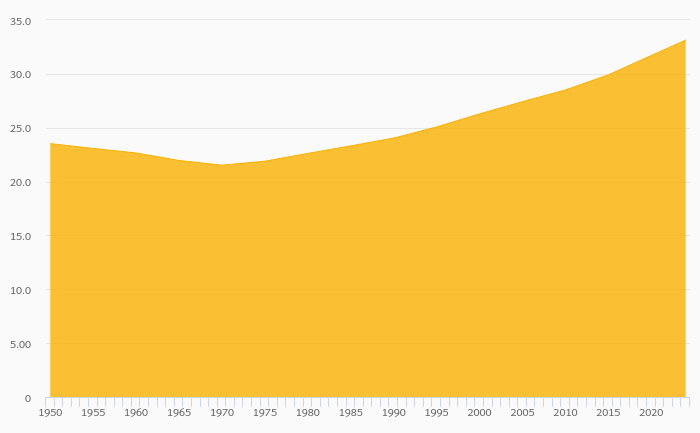 Median Age rose 1.09% to 33.1 years in the World in 2024