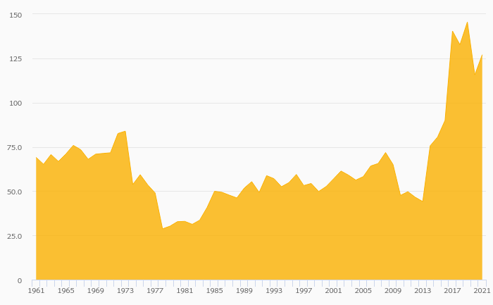 Alcoholic Beverage Consumption Per Capita (Total) rose 9.84% to 127 litres in Botswana in 2021