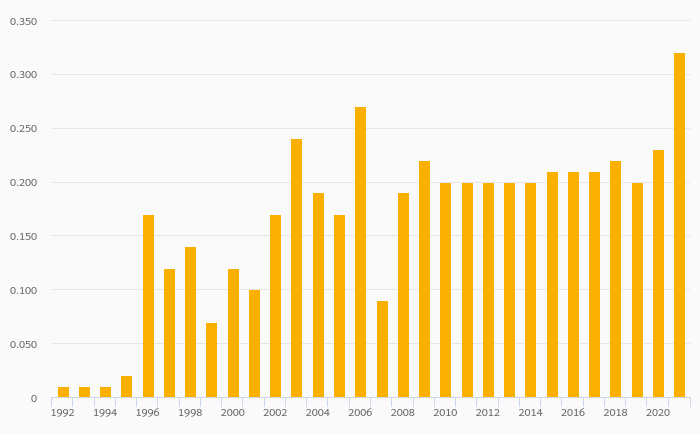 Coconut Consumption Per Capita rose 39.1% to 0.320 kg in Romania in 2021