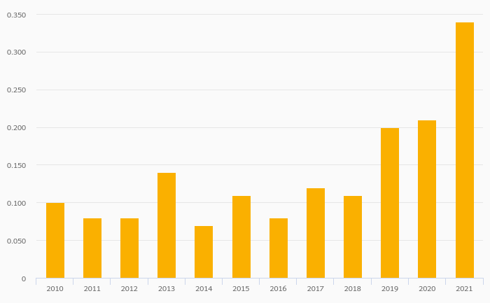 Alcoholic Beverage Consumption Per Capita (Distilled) rose 61.9% to 0.340 litres in Comoros in 2021