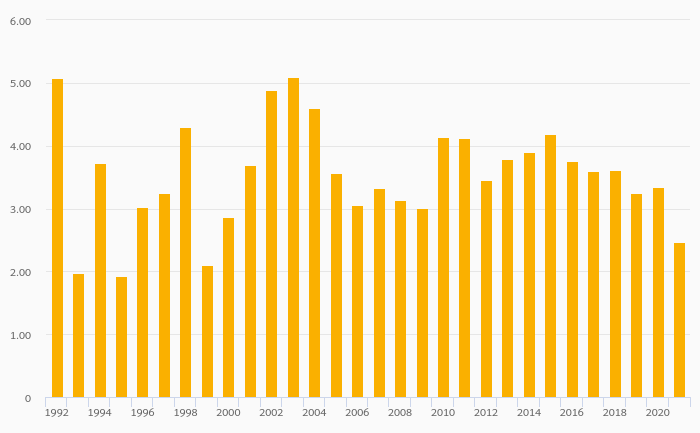 Alcoholic Beverage Consumption Per Capita (Distilled) fell 26.0% to 2.47 litres in Kyrgyzstan in 2021
