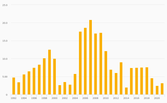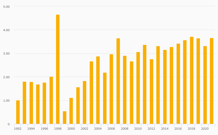 Alcoholic Beverage Consumption Per Capita (Distilled) rose 30.1% to 3.20 litres in Latvia in 2021