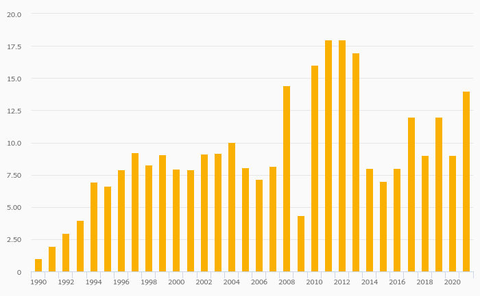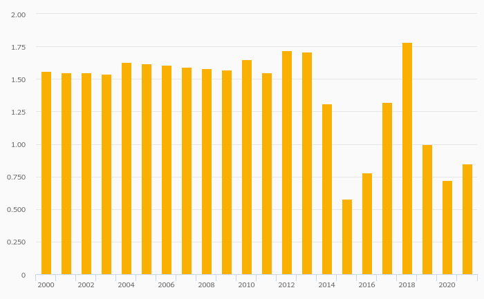 Alcoholic Beverage Consumption Per Capita (Distilled) rose 18.1% to 0.850 litres in Belgium in 2021