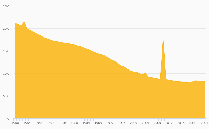 Crude Death Rate (Per 1,000 People) fell 0.299% to 8.22 deaths in Haiti in 2024