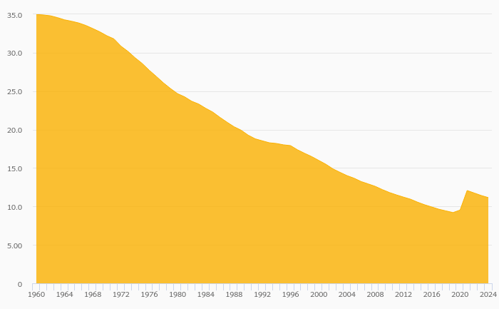 Crude Death Rate (Per 1,000 People) fell 2.39% to 11.1 deaths in Mali in 2024