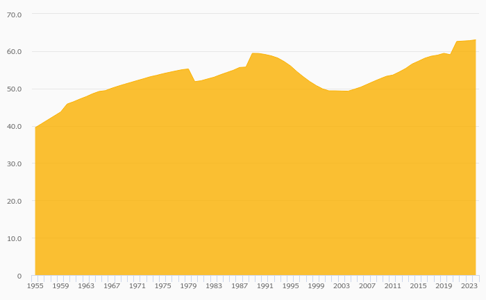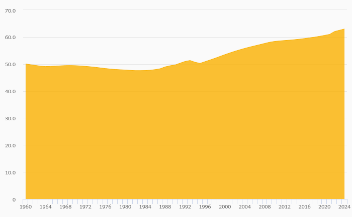 Population Aged 15-64 Years (As % of Total Population) rose 0.759% to 63.0% in Swaziland in 2024