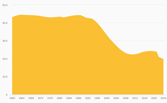 Population Aged 0-14 Years (As % of Total Population) fell 2.97% to 19.6% in Iran in 2024