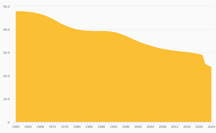 Population Aged 0-14 Years (As % of Total Population) fell 2.61% to 23.6% in Fiji in 2024