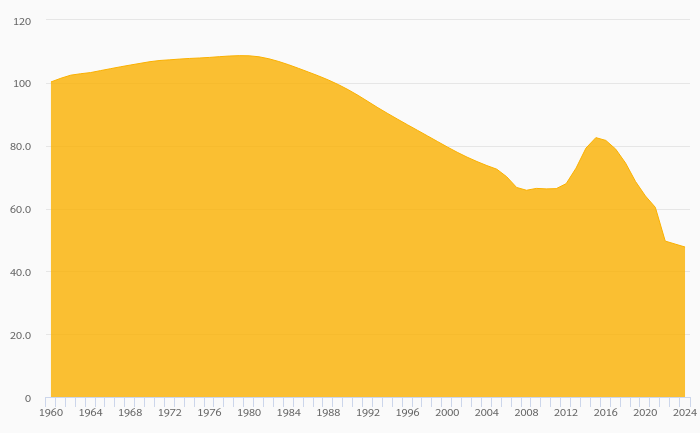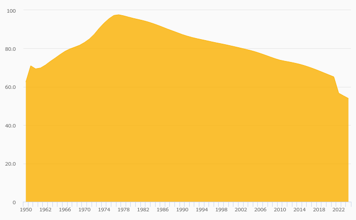 Total Dependency Ratio fell 1.93% to 47.7% in Syria in 2024