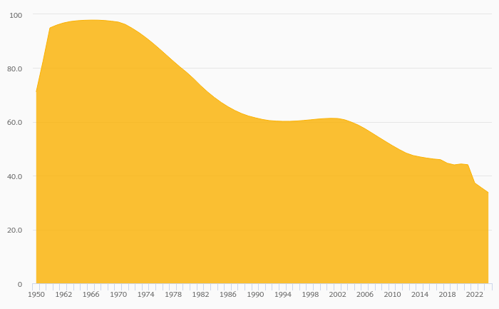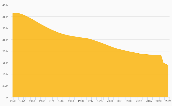 Youth Dependency Ratio fell 4.99% to 33.7% in Guyana in 2024