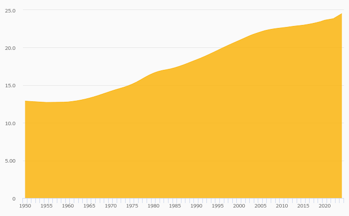 Old Age Dependency Ratio rose 1.40% to 24.5% in Uruguay in 2024
