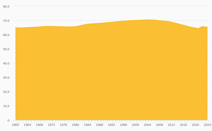 Population Aged 15-64 Years (As % of Total Population) fell 0.264% to 65.4% in Slovenia in 2024