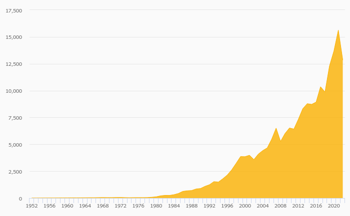 Households' Assets In Investment Funds (Local Currency) fell 17.8% to USD 12,841 bil in the USA in 2022
