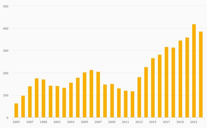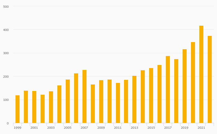 Households' Assets In Investment Funds (Local Currency) fell 7.75% to EUR 386 bil in Spain in 2022