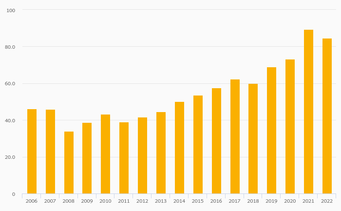 Households' Assets In Investment Funds (Local Currency) fell 5.31% to EUR 84.6 bil in Austria in 2022
