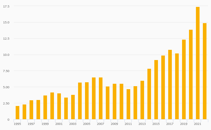 Households' Assets In Investment Funds (Local Currency) fell 14.2% to EUR 14.9 bil in Luxembourg in 2022