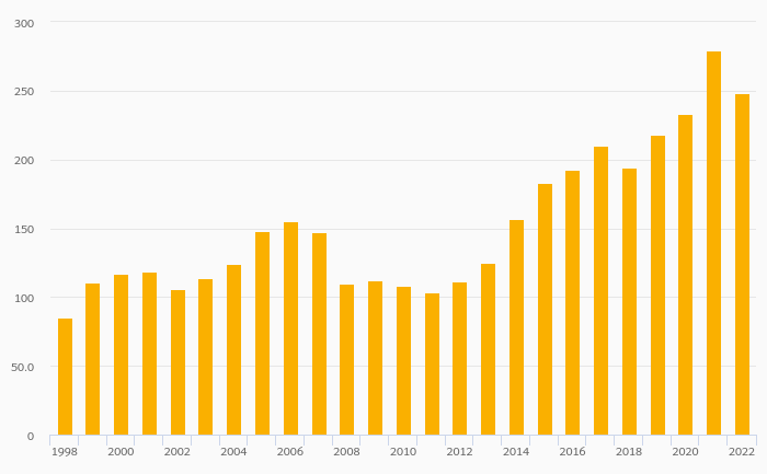 Households' Assets In Investment Funds (Local Currency) fell 11.1% to EUR 248 bil in Belgium in 2022