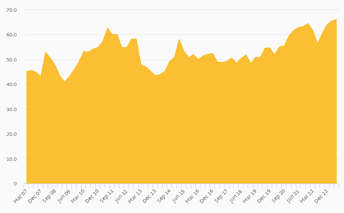 Households' Assets In Life Insurance Reserves (Local Currency) rose 17.5% yoy to EUR 66.2 bil in Ireland in 2Q2023