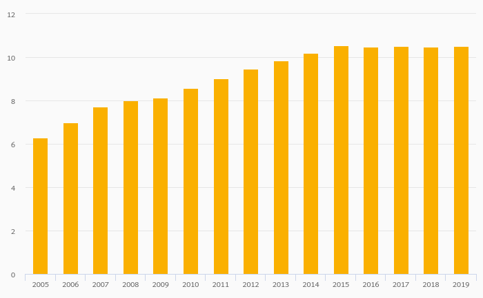 Passenger Cars Per 1,000 People rose 0.196% to 10.5 vehicles in Mali in 2019