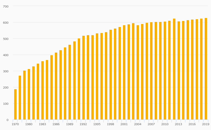 Passenger Cars Per 1,000 People rose 0.509% to 627 vehicles in Italy in 2019