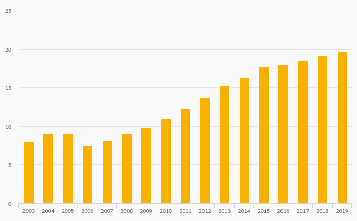 Passenger Cars Per 1,000 People rose 2.93% to 19.7 vehicles in India in 2019