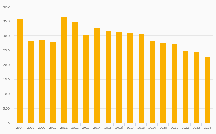 Bank Liquid Assets (As % of Short-Term Liabilities) fell 0.036% to 23.8% in Finland in 2023