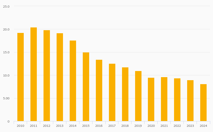 Bank Pre-Tax Return on Equity (Pre-Tax ROE) fell 9.28% to 8.10% in China in 2024