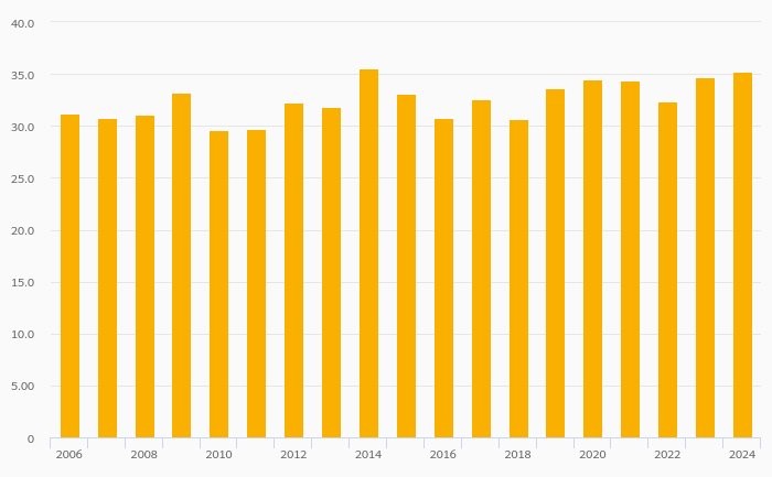 Bank Liquid Assets (As % of Short-Term Liabilities) rose 1.61% to 35.3% in Thailand in 2024