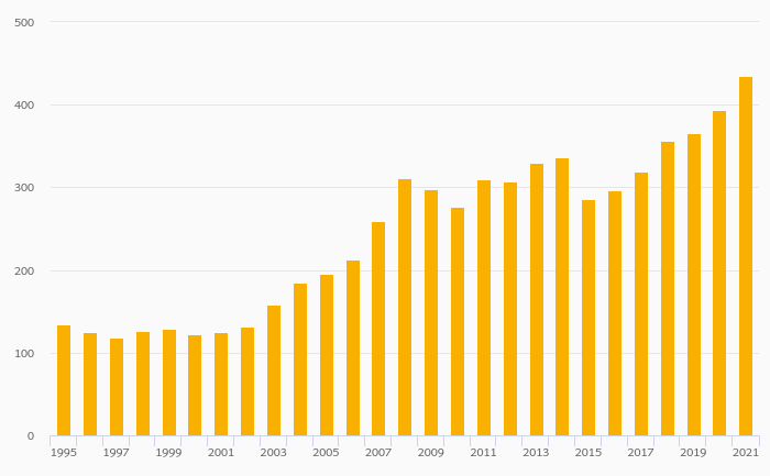 Households' Assets In Dwellings (USD) rose 10.5% to USD 434 bil in Finland in 2021
