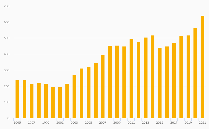 Households' Assets In Dwellings (USD) rose 13.4% to USD 641 bil in Austria in 2021