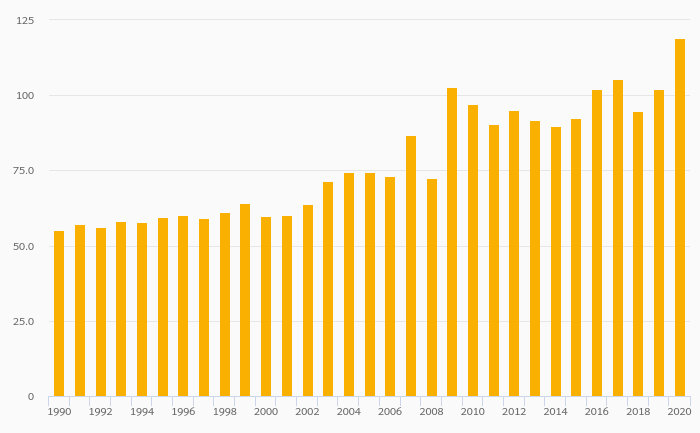 Total Household Liabilities (As % of GDP) rose 16.7% to 119% in Canada in 2020