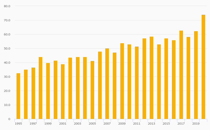 Total Household Liabilities (As % of GDP) rose 18.7% to 74.0% in Belgium in 2020