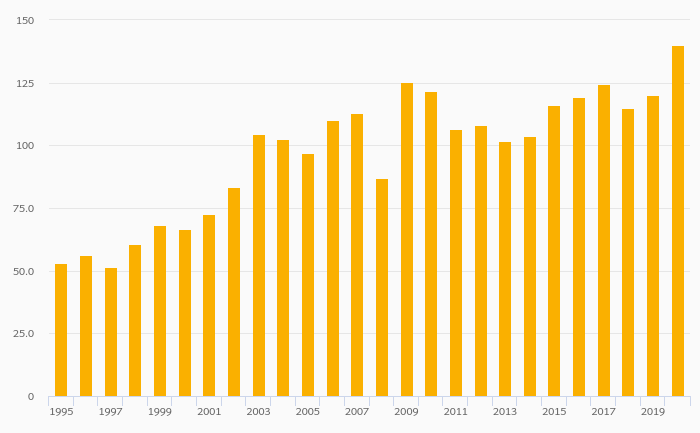 Total Household Liabilities (As % of GDP) rose 16.7% to 140% in Australia in 2020