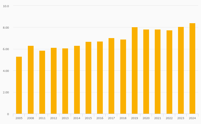 Bank Equity (As % of Bank Assets) rose 4.45% to 8.41% in India in 2024