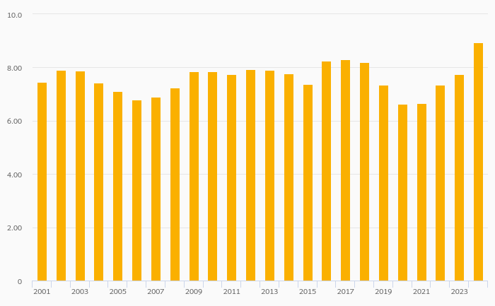 Bank Equity (As % of Bank Assets) rose 15.4% to 8.95% in Chile in 2024