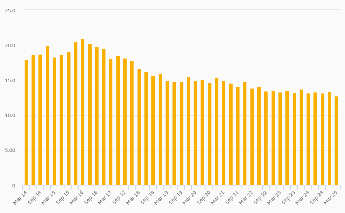 Bank Equity (As % of Bank Assets) fell 3.16% yoy to 12.7% in Iceland in 1Q2025