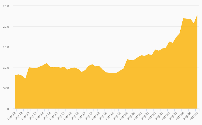 Bank Equity (As % of Bank Assets) rose 4.01% yoy to 22.8% in Argentina in 1Q2025