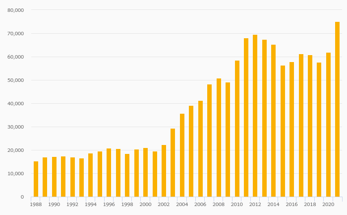 Households' Dwellings Assets Per Capita (USD) rose 21.5% to USD 75,110 in Australia in 2021